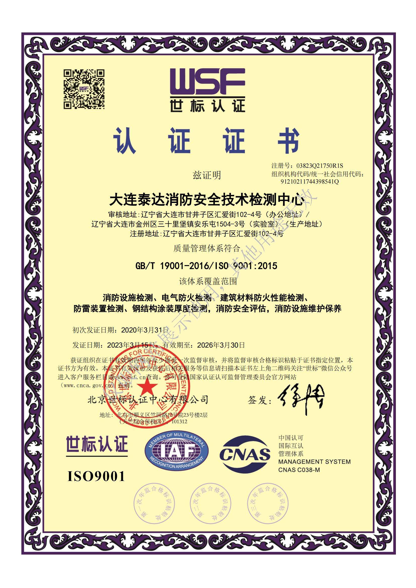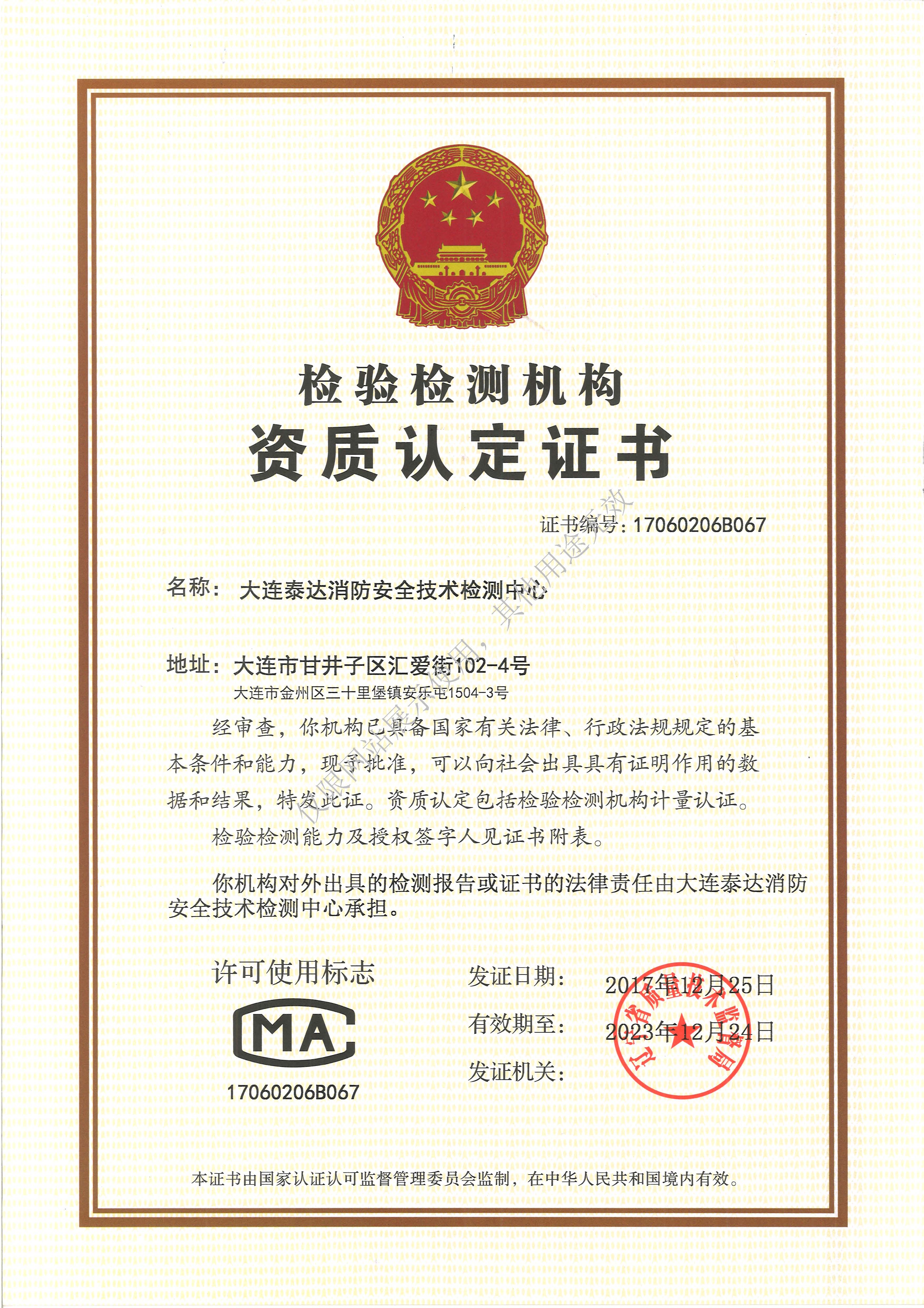 · 是經“社會消防技術服務信息系統(tǒng)”備案并公示的消防技術服務機構,已取得中國氣象局頒發(fā)的雷電防護裝置檢測資質證書、遼寧省質量技術監(jiān)督局審核批準的檢驗檢測機構資質認定證書(CMA)及包括消防檢測、電氣檢測、雷電防護裝置檢測、防火涂層厚度檢測等在內的200余項檢驗檢測能力,取得大連市應急管理局頒發(fā)的安全生產標準化證書,獲得質量管理體系、環(huán)境管理體系、職業(yè)健康安全管理體系認證證書,是經備案的高新技術企業(yè),可獨立出具具有證明作用的檢測報告。
